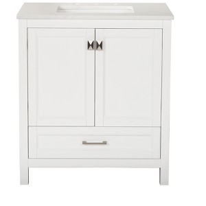 Product Name: SEVOBAL Bathroom Storage Cabinets, Stand alone Bathroom Vanity including Sink, Carrara Engineered Marble Vanity Top with an Undermounted Rectangular Ceramic Sink, and a Large Storage Cabinet with Soft Closing Door, White, 29.92"*19.09"*34"