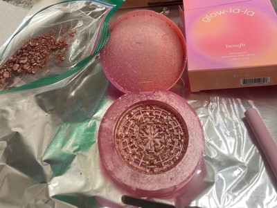[This review was collected as part of a promotion.] I was disappointed to find my Benefit Glow La La highlighter arrived damaged. The formula itself seems soft and blends out easily. The base is light pink, suitable for my fair skin tone. In the sun/brighter light it's quite glittery & reflects every color of the rainbow. It is pretty for a glam look, but not something I am likely to reach for in my day-to-day makeup routine.