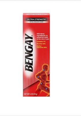Get powerful relief at the site of pain with Ultra Strength Bengay Topical Pain Relief Cream. This non-greasy, ultra strength pain relief cream provides penetrating relief from muscle aches and joint pain. With three pain-relieving ingredients, more than any other Bengay product, this topical analgesic cream provides pain relief from minor arthritis pains, backache, muscle aches, joint pain, strains, bruises, and muscle sprains. The topical cream is formulated with three powerful pain-relieving ingredients: 4% camphor, 10% menthol, and 30% methyl salicylate. Use only as directed. Adults and children 12 years and older, apply to the affected area no more than three to four times daily. Mas-sage the topical pain-relieving analgesic into skin for penetrating pain relief. Bengay, physician-recommended OTC topical analgesic, comes in a tube for convenient application. Keep a tube in your gym bag or travel suitcase for pain relief whenever you need it.