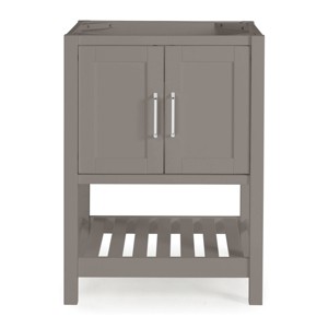 Enhance your bathroom or powder room space with this freestanding vanity base cabinet that has a classic look as well as ample storage space. Made from solid pine wood and composite wood, the base features two paneled shaker doors with sleek nickel handles that allows you to store cleaning supplies and other bathroom essentials. An open, slatted bottom shelf offers additional room for bath towels or accessories. The clean white finish complements a wide range of decors. Vanity top and sink are not included.