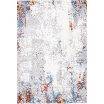The striking BLUE RUST/IVORY color palette is beautifully showcased in a modern, abstract pattern that captures a harmonious blend of colors and shapes, imparting a sense of movement and depth to your floor. This captivating design is not only a visual feast but also a tactile delight, thanks to its high-quality polyester fibers which ensure a soft and silky underfoot experience.