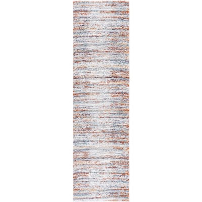 The striking BLUE RUST/IVORY color palette, presented in an abstract pattern, integrates seamlessly into modern and transitional interiors, adding visual interest and a touch of elegance to any hallway or living space. Rich hues of blue blend effortlessly with warm rustic tones and a refreshing ivory background, creating a serene yet vibrant atmosphere.