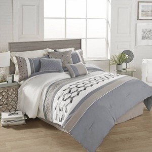 Introducing the Beren 7 Piece Comforter Set from Riverbrook Home. Cool and contemporary, the Beren 7 Piece Comforter Set is the perfect combination of geometric design and embroidered details. A cool and calm palette of gray and taupe; this ensemble includes: 1 Comforter, 2 Standard or King Shams, 1 Bedskirt, and 3 Bonus Embroidered Decorative Pillows for a convenient all-in-one package. Polyester fabric and fill. Machine Washable, follow care instructions on each piece for best results.
