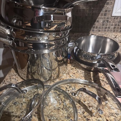 Includes: 1.5 qt. Saucepan With Lid, 3 qt. Saucepan With Lid, 5 qt. Stockpot With Lid, 9.5" Steamer, 8" Frying Pan, 9.5" Frying Pan, 10.5 Inch Skillet With Lid