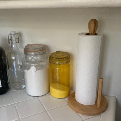 When cooking gets messy, turn to this 13.75” bamboo paper towel holder and tear off a paper towel to manage the mess. The central mast keeps the paper towel roll safely in-place, while the knob-topped guidepost keeps the roll from unraveling where it stands. It’s easy to tear off a single sheet, with the next readily available for you to grab. Fits most regular and mega-sized rolls. Bamboo construction is easy to clean and maintain with soap and water.