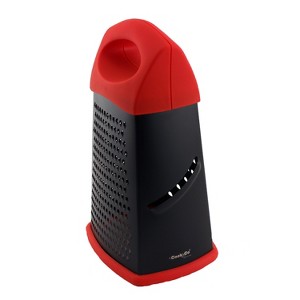 Stylish and efficient, the CooknCo Non-Stick Grater makes grating ingredients such as cheese and carrots fast and hassle-free. It features a comfortable top handle for ergonomic use and an anti-skip base, ideal for grating and shredding many different food types. When it comes to grating, you want to an enjoy uninterrupted technique, which is why the non-stick design provides. You can experience grating that doesn't cause the ingredients to get stuck, which usually is the cause for massive frustrations when preparing a recipe. This innovative grater makes all the difference. The contrasting red and black color scheme adds to its impressive design, with hand-wash recommended to extend its durability. 10" 3-sided grater with top handle and anti-skip base. Perfect for grating and shredding cheese, vegetables, and more! Everyone loves to have options when it comes to grating, not too big, nor too small. You can choose any style that suits your needs.