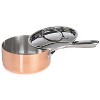 - Set includes 7" saucepan 2qt. with matching lid, 8" and 9.5" deep skillet. Exclusively designed with tri-ply material including 18/10 stainless steel, aluminum core and copper exterior. Featuring ergonomically designed comfort-grip handle. Polished finish.