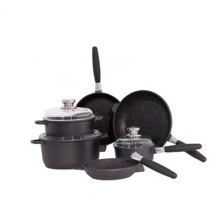 EuroCAST by BergHOFF is a premium cookware line featuring an eco-friendly and toxin-free non-stick cooking surface. One of the lightest cast pans on the market, it's heavy-duty construction stands up to constant and rigorous use without warping and chipping.With a proprietary ceramic blend cooking surface and ferrous bottom plate, heat is distributed quickly and evenly and can be used on any cooking surface, including induction. Removable handles create oven-safe vessels for fully functional and versatile cookware with easy storage. This set includes 1x 1.2 Qt Saucepan, 1x 3 Qt Saucepan, 1x 5 Qt Dutch Oven, 1x 10" High-Sided Saute Pan, 1x 8" Saute Pan, 1x 11" Saute Pan.