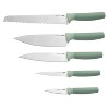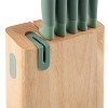 - 6-PIECE VERSATILE SET: Chef knife 7.5", Bread knife 9", Carving knife 7.5", Utility knife 4.5", Paring knife 3.25", Knife block 9" x 7" x 3", Forest. Crafted from High-quality Stainless Steel with a sleek satin finish. This set is made from recycled polypropylene and thermoplastic rubber and features an ergonomically designed handle for a comfortable and secure grip. Heavy-duty stylish wooden block with integrated magnet for scissors, and built-in knife sharpener.