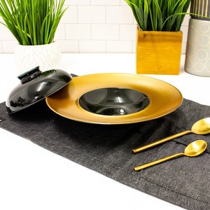 Featuring this deep presentation plate with golden rim, the elegant way to serve. The high-quality porcelain with glossy finish instantly adds a touch of glamour to meals and is dishwasher safe, for a fast & easy cleanup. The matching bowl can either be used as a cover to add an element of surprise or as a separate item to serve a side dish.