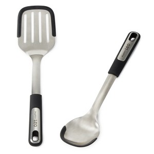 Upgrade your kitchen with this versatile Graphite 2pc Turner and Serving Spoon Set! This set features a durable stainless steel serving spoon and slotted turner, both with silicone head covers for gentle handling and recycled PP handles for a comfortable grip. The serving spoon is perfect for serving soups, stews, salads, and more, while the slotted turner is ideal for flipping pancakes, eggs, fish, and vegetables. The sleek and modern design complements any kitchen decor, making this set both practical and stylish. Enjoy years of reliable use with this high-quality and versatile set! Set includes: 13.5" Slotted Turner, 13.5" Serving Spoon