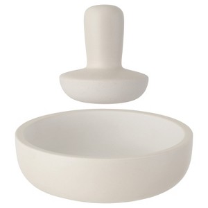 - White durable stoneware mortar 6.75" x 2", and pestle 3.25" x 3 .5"