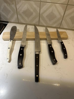 Want to store your knives without using a valuable countertop or drawer space? Mount this magnetic knife holder on your kitchen wall and store all the Ron knives safely within reach. The strong magnetic strips ensure the knives are fixed securely to the ash wood holder which gets a beautiful patina over time. Whatever cutting job you’ve got to tackle, your knives are at your fingertips! 15.75" Wall Knife holder will mount right to your wall and store all Ron knives safely within reach.