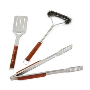 - This BBQ tool set includes stainless steel 16.25" BBQ Tongs, 16.25" BBQ Brush, and 16" BBQ Turner with long, ergonomic wooden handles. Each tool is crafted with high-quality stainless steel for strength and rust resistance, while the natural wooden handles provide a secure, heat-resistant grip. The matching set brings performance, durability, and timeless style to any backyard grilling session or outdoor cooking event.