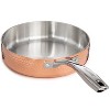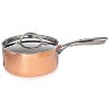 - Set includes: 8" saucepan 3qt., 9.5" stockpot 5.75qt., and 9.5" deep skillet. Made of tri-ply material consisting 18/10 stainless steel material, aluminum core and copper exterior with ergonomically designed comfort-grip handle and hammered finish. Includes matching lids.