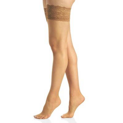 With the stay up top, there is no need to wear a garter. An invisible toe so you can wear your favorite peep toe pumps or sling backs. Choose from an array of colors.