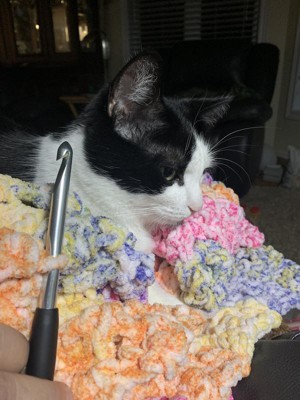 I love the Bernat Blanket Yarn. It always makes quick throws for gifts and they are always a hit. For several years now there is at least one or two friends or family that will ask for one so when I first saw this new Ethereal line on Target’s website? I was REALLY wanting to get my hands on some. Felt VERY fortunate to be able to snag the Sunrise color. It arrived today and I started a blanket after dinner. Family voted, nothing fancy, just crank out a HDC “no holes” blanket. (I have all boys so, that is typical-I won’t ask opinions if I have a “fancy” stitch in mind… ANYWAY …. The color change is great, it’s very soft and works easily on my resin (Furls) hook. This line reminds me a bit more of the now discontinued PREMIER YARNS GUMDROP™ CHENILLE in softness and HOWEVER 🥺when I went to just weave in the bottom that was bothering me a few rows in, the chenille started to just fall off the end. I don’t ever remember that really happening for more than just a few mm before but unlike the Premier Gumdrop Chenille, the thread it’s attached to was very delicate. Usually I’ll just remove the loose chenille and tie off the thread or attach it if I find a knot etc. Not so far on the Ethereal. I am REALLY, REALLY hoping this is a fluke. The ends of the Bernat Blanket yarns chenille not falling off en-mass is one of the things I just LOVE about the line. Obviously I’m going to keep on going but this will be a major bummer if this is normal for this line b/c I was hoping to buy more color ways. *in my photos, I decided to take a photo after I had already tossed most of the fallen chenille.