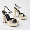Own the spotlight in these high-shine platform heels. Featuring a bold block heel and glossy upper with a sleek slingback strap, they bring drama to any evening look. Perfect for parties or a statement night out.