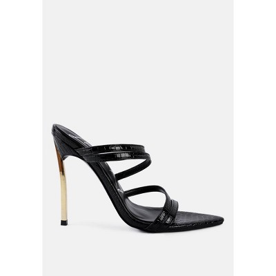 Make a refined statement with these slender stiletto sandals. Available in either sleek glossy patent or modern clear strap design, each pair is finished with a polished metallic heel and minimalist silhouette. Perfect for dressing up formal events or special nights out.