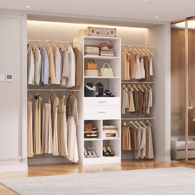 Besiost Closet Organizer System with Wood Drawers, 120-In Wardrobe with Hanging Rods and Storage Shelves - White