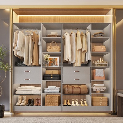 - Ample Storage: 4 spacious shelves provide ample room to keep items neatly organized. 1 hanging rod for keeping clothes wrinkle-free. 2 wood drawers offer convenient storage for smaller items. 1 spacious compartment for suitcases or large items.