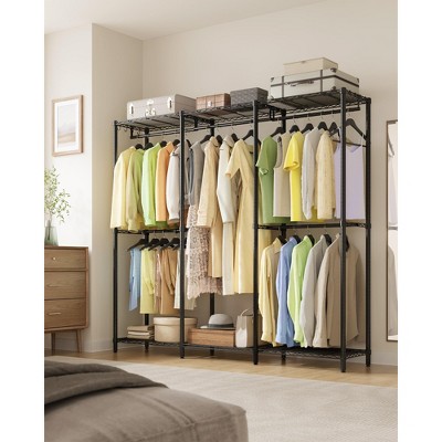 Height-Varied Versatility: Four hanging rods at different levels plus three adjustable racks adapt to long gowns, suits, jackets, and accessories in this closet organization system