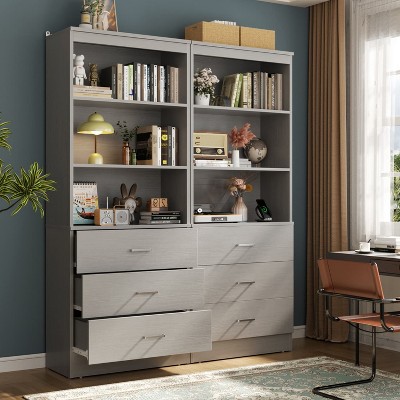 Besiost Bookcase with Charging Station, Storage Bookshelves with Wood Drawers - Dark Gray