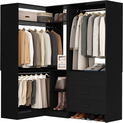 Are you tired of closets that can't handle your wardrobe? This set of 2 closet system stores over 600 clothing items and gives you the flexibility to organize everything in one place. The closet organizer set includes three separate units that work together or apart: one with ten shelves, one designed for corners, and one with dedicated suitcase storage. Across all three pieces, you get eighteen sturdy shelves, four hanging rods, and four wooden drawers. The shelves hold folded t-shirts, sweaters, jeans, shoe boxes, storage baskets, extra bedding, and towels. The four rods let you sort dresses, jackets, and shirts by length or season—keep long winter coats on one rod and short blazers on another. Two enclosed drawers protect private items like undergarments and valuables, while two semi-open drawers give you quick access to shoes and handbags. A special lower compartment stores suitcases, duffel bags, or large storage bins. Start maximize your space with this closet system!
