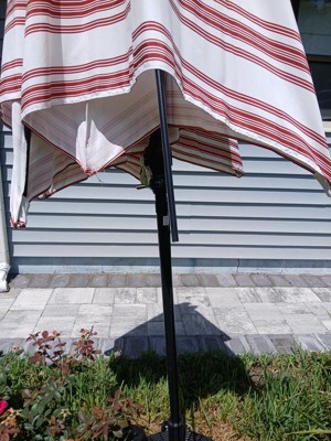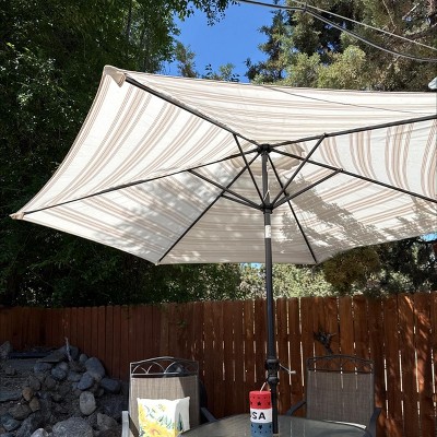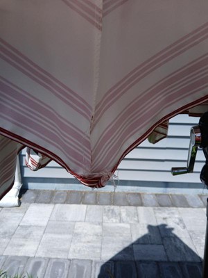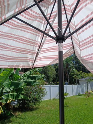 The color white with green stripes is perfect for our deck which is situated among pine trees to the side of our deck where it hovers over our white wrought iron glass table. The umbrella arrived in perfect condition and has a clean, refreshing look over our round table.