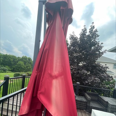 We took out of storage to place on our deck and saw how faded it was on top and in some areas in the folds. The cover even tore, like sun damage/rotted. We have had the umbrella for just a year. It has faded terribly. We keep the cover on it most days and bring inside for storage over winter. We love the heavy bottom to keep from toppling over in wind. But the base cover doesn’t fit well and stay on. The crank handle is also rusting. For the expensive price…. Not worth the poor quality.