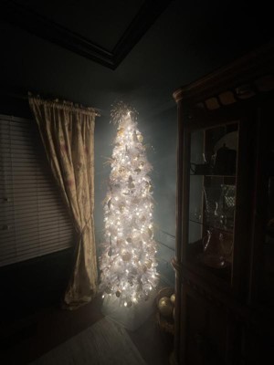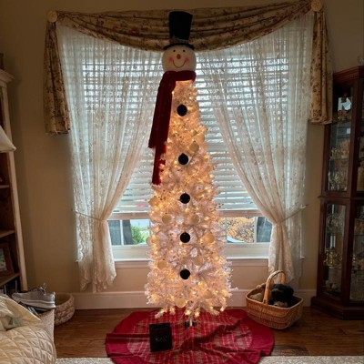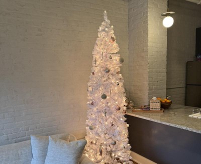 Create a regal and inviting holiday centerpiece with our Pre-Lit White Pencil Christmas Tree, drawing inspiration from the wintry season. Available in various heights, it boasts abundant branch tips for a lush appearance and assembles effortlessly with a simple tab and slot system. Crafted with durability in mind, this tree features high-quality materials, including metal supports and flame-retardant PVC branches, all held securely by a sturdy metal base. Pre-lit with warm white incandescent lights (ranging from 250 to 900 lights depending on the size), it adds a warm and cozy ambiance to your festivities. Whether it's the accent or the focal point, this slender yet full tree will elevate your holiday decor with elegance and grace.