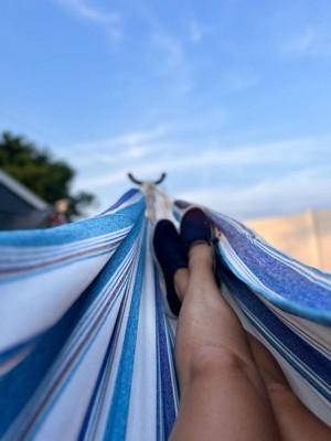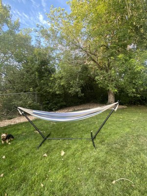 [This review was collected as part of a promotion.] Love love love it! It was so easy to put together, take down and put in the bag. It’s also lightweight and easy to move around your yard. The material is strong and so is the frame. I ordered the hammock for two in blue and white. I saw this when I was visiting my daughter in Washington and kicked back in it during my trip. I had to have one when I got home so she sent me the link where she got hers.