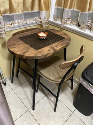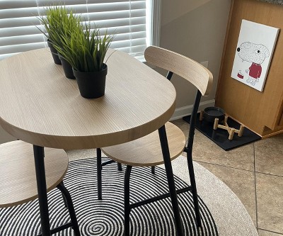 I’m absolutely thrilled with this dining set! It fits perfectly in my small kitchen and still manages to feel roomy enough for two people to enjoy a meal comfortably. The oval table shape gives it a modern touch, and the chairs are surprisingly sturdy and comfortable for the price. Assembly was quick and straightforward—I had it set up in under an hour. The wood finish is beautiful in person and adds warmth to my space. It's great for coffee in the morning, quick meals, or even working from home when I need a break from my desk. If you're looking for an affordable, space-saving dining solution that doesn’t sacrifice style, this is a fantastic choice. Highly recommend!