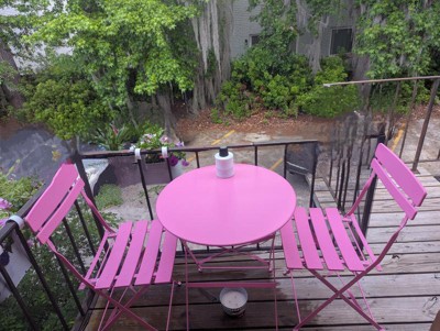 Imagine a charming bistro set that effortlessly brings a relaxed bohemian vibe to your home. Its compact profile makes it perfect for a cozy kitchen nook or as a stylish focal point on your patio or balcony. The convenient folding design allows for easy storage when not in use, and it comes fully assembled for immediate enjoyment. With vibrant colors to choose from, this set adds a splash of joy to your decor, seamlessly matching your personal style. Comfortably seating two, it's the ideal spot for intimate dinners or leisurely chats. Crafted with a solid steel frame, it's built to last, ensuring you can embrace carefree outdoor living with ease.