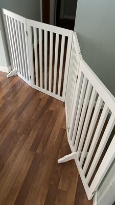 Sometimes your pawed pal needs to stay in one place. This free-standing 4-panel pet gate sports a high 31.5-inch height to keep even the best puppy acrobats safely corralled. Stable & durable, a set of support feet with rubber-padded bottoms help keep the gate sturdy and firmly locked in place. You don't need to worry about space with this gate! The slim & collapsible panels fold and stack for easy carrying and space-saving storage. The durable wood construction adds to this piece's quality, made of strong MDF wood to help ensure long-lasting use. This fence is perfect for small to medium-sized pets. It also includes set of 2 extra rods to close the gate. Attach additional panels to cover more ground or create an enclosed pet play pen. A built-in door with a safety lock allows easy, convenient access while a set of 360-degree double hinges adds optimal panel flexibility. Your pet may not thank you, but your peace of mind will be worth it!