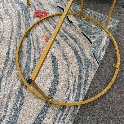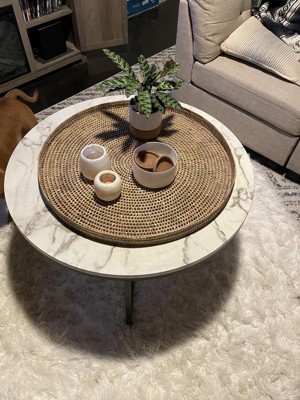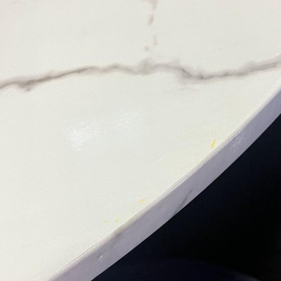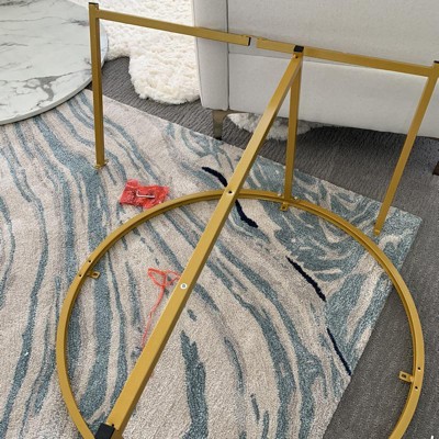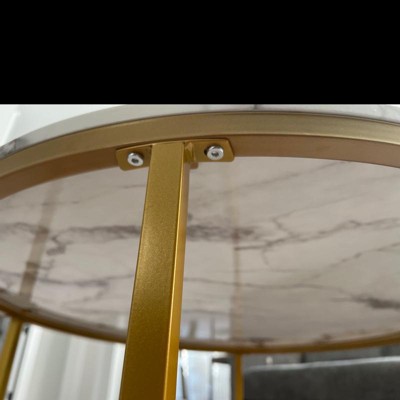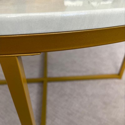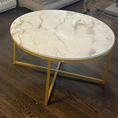 The faux marble top is beautiful, will pass as authentic and its very sturdy as long as it’s in a place that’s not used often (we wanted it for master bedroom sitting area) but the brass color of the base looks cheaply painted, cheap metal, don’t know how else to describe it the “yellow-ness” like spray paint gold, and not what I’d expected based on photos. We have mixed metals in the bedroom so I didn’t mind it being different shade or tone of brass but it’s just too yellow. Really stands out. I’m bummed as I like the top and the price was perfect for something mostly decorative. It’s also bigger than I expected, so the price is definitely a steal if you don’t mind the base color. It just really stood out against our ivory/white chaises and ivory rug. I already returned it but we panicked it up exactly as shipped, grateful for Target’s return policy flexibility. I would still recommend it as I am a bit picky, but someone else could really love it.