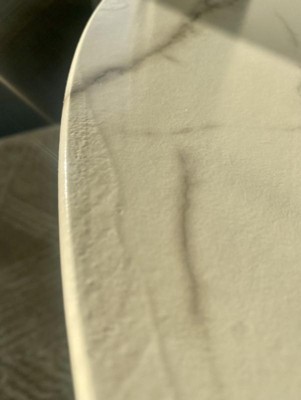 We kept thinking there was a clear wrapping on the table bc it bunched up in areas. Wish I would’ve read the reviews first. Ours has ridges from the sticker marble top. Super disappointing.
