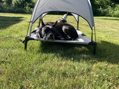 I bought this product for my three labs to enjoy outside since they love their inside raised bed. It was very easy to put together and is very sturdy due to the reinforcement bars that allow my 110 lb dog to lay on it. They did not like the covering so we took it off but overall a great purchase.