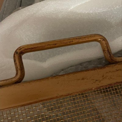 Zoom in on the picture to get an understanding of the color - I guess it is meant to look antique-y so it’s not a solid gold color. It really is more like a tarnished “gold” and will probably need to be repainted. It works for our purposes, though - I’m just blocking an unsightly fireplace