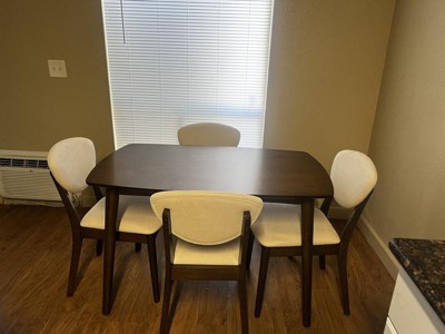 [This review was collected as part of a promotion.] I had my eye on this for a while and it even sold out when I was trying to make a decision. Eventually I just went for it and I’m glad I did. My apartment is on the smaller side but this fits the space perfectly. I was set on finding something that seated four people but would suit the smaller space and this was it. Im ultimately happy with my purchase but I noticed when I was unpacking the table top it had a dent in it, almost like it was dropped. It’s small but noticeable. It’s not enough for me to deal with the hassle of trying to get a new one but it is disappointing. This was also not too difficult to put together with the help of another person, but it’s doable if you’re on your own.