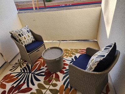 This patio set is highly praised for its quality, comfort, and convenience. Guests appreciate that it comes fully assembled and fits well in small spaces. The set includes comfortable chairs, ottomans that store under the chairs, and a useful table with storage. While some guests noted issues with cushion durability and size, the overall sentiment is positive, making it a great choice for compact outdoor areas.