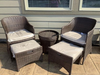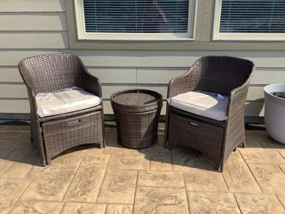 I purchased this set at a sale price. Loved that it came already assembled and I am pleased with the quality of the furniture. The chairs are comfortable and the ottomans are a nice addition. The small table that comes with the set is useful as it provides both a place for storage as well as a table top for eating. I recommend this to people with a small patio and look forward to using this set in the upcoming summer months.