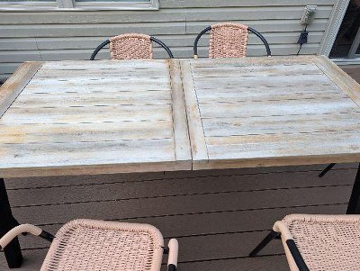 Loved the table but after only 2 seasons, the wood top has bowed and in some areas has even broken off. Extremely disappointing as the table is gorgeous however it definitely isn’t “weatherproof”