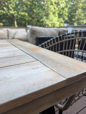 Loved the table but after only 2 seasons, the wood top has bowed and in some areas has even broken off. Extremely disappointing as the table is gorgeous however it definitely isn’t “weatherproof”