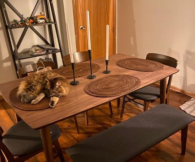 I love the size and possibility of arrangements with this dining set. The finish has a nice natural look. The bench side is so practical for hosting guests. The table fits our family and a few guests, yet it seems to fill our dining room or fit in our cozy nook. It’s just right!