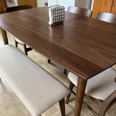 We’ve only had this table for about 6 months now, but it’s held up well so far! It looks great in our space, and cleans up easily. We really love the bench, which makes it feel a little less intrusive because the whole thing can be tucked underneath.
