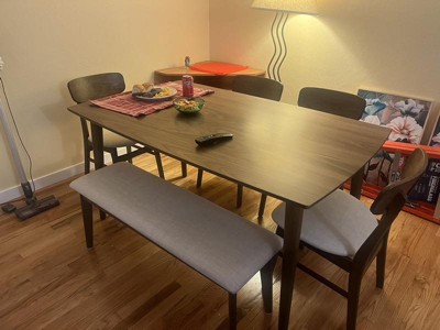- DURABLE CONSTRUCTION: A sturdy MDF tabletop is finished with a beautiful wood grain veneer, while the striking chairs & bench are crafted from solid rubberwood with a premium upholstered seat