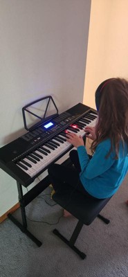 Making music has never been so easy! Learn by playing, follow along as keys light up in teaching mode, and play your way to proficiency. Create your own full masterpiece when you mix timbres and rhythms or explore the keyboard percussion sounds and in effect, customize your sound. Here's what's included: a keyboard, a music holder, a stand (15in x 32in x 22.5-27in), and a chair (12in x 16in x 19in). All of these tools are perfect for beginners, as they explore this piano's different functions and use them to sharpen their playing skills. Headphones are included, wear them to cancel surrounding distractions when you need that extra focus thanks to the padded speakers. From pros to beginners this piano is ready for you!
