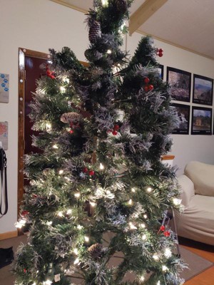 - PRE-DECORATED DESIGN: Made with 250, 350, 460, and 700 incandescent lights (based on tree size), with pine cones and artificial berries evenly dispersed throughout the tree's partially flocked branches to create a natural look that brings a feel of the outdoors into your space