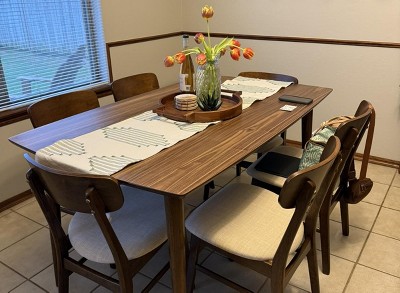 [This review was collected as part of a promotion.] We are absolutely in LOVE with our new 7-piece mid-century modern dining set. The wood and upholstered chairs are not only gorgeous, but they’re so comfortable too! We also added these stylish 2-piece dining chairs that perfectly complement the set.